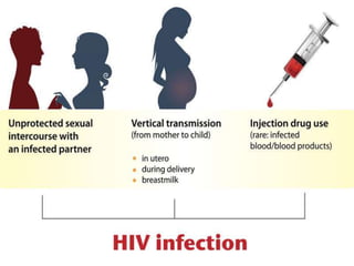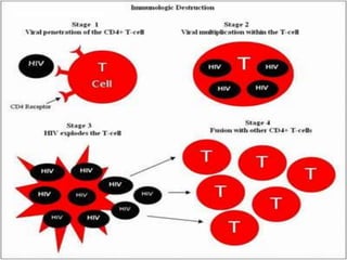 This document summarizes AIDS (Acquired Immunodeficiency Syndrome) and HIV (Human Immunodeficiency Virus). It discusses that AIDS is caused by HIV, which belongs to the lentivirus family (HIV-1 and HIV-2) and targets CD4 T-cells. HIV transmission occurs through sexual contact, blood exposure, and from mother to infant. The life cycle and structure of HIV is also outlined. The clinical features of AIDS are described in three stages: acute, chronic, and crisis phases. Treatment options like antiretroviral therapy and acupuncture are also mentioned.