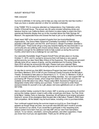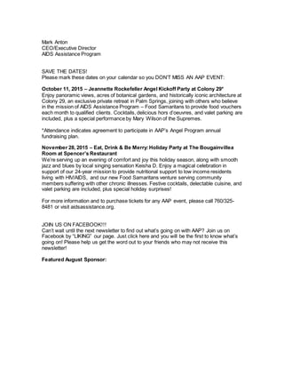 The AIDS Assistance Program (AAP) held a successful Independence Day celebration in July and received grants totaling $55,000 from local foundations to help those suffering from chronic illnesses over the summer months. Upcoming events include the Jeannette Rockefeller Angel Program kickoff in October featuring Mary Wilson and a holiday party in November with singer Keisha D. Support is still needed to provide $50,000 in monthly food vouchers for AAP clients.