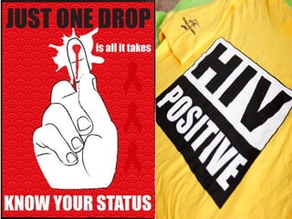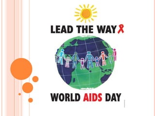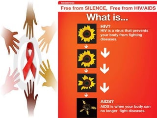AIDS is a disease caused by the HIV virus that weakens the immune system. There are currently around 33 million people living with HIV/AIDS worldwide. The virus originated in chimpanzees in central Africa and was first reported in the United States in 1981. HIV attacks CD4 cells and a person is diagnosed with AIDS when their CD4 count drops below 200 or they contract an opportunistic infection. HIV is transmitted through sexual contact, blood transfusions, needle sharing, and from mother to child during pregnancy or breastfeeding. Prevention focuses on abstinence, monogamy, condom use, safe needle practices, and preventing mother to child transmission. While treatment with antiretroviral drugs can suppress the virus,