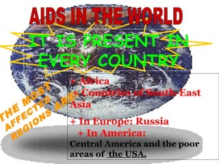 This document summarizes the global impact of AIDS, noting that it has killed over 60 million people since the beginning and is still infecting over 5 million new people each year. Africa has been disproportionately affected, with over 25 million people living with HIV/AIDS in 2005 alone. Some of the hardest hit countries include South Africa, Botswana, Zimbabwe and Kenya, where AIDS has become a major cause of death and has left millions of children orphaned. The epidemic continues to grow rapidly in many parts of the world without effective prevention and treatment efforts.