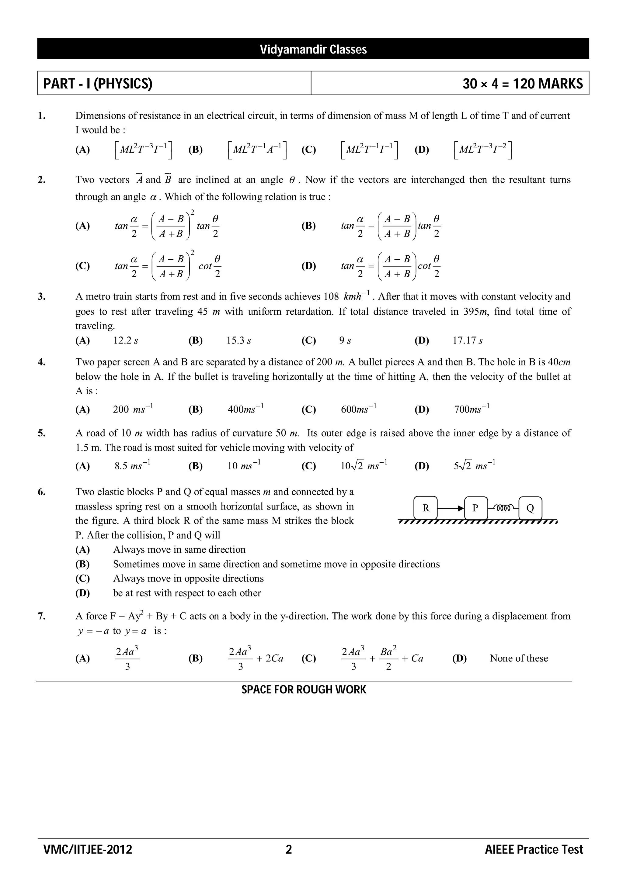 Vidyamandir Classes provides practice tests to help students prepare for the AIEEE exam. This document describes a practice test from 2012 that covers physics, chemistry, and mathematics. It provides instructions for taking the test, which contains 90 multiple-choice questions across three sections. The test is designed to help students practice for the AIEEE exam, which evaluates students' preparedness for admission to engineering colleges in India.
