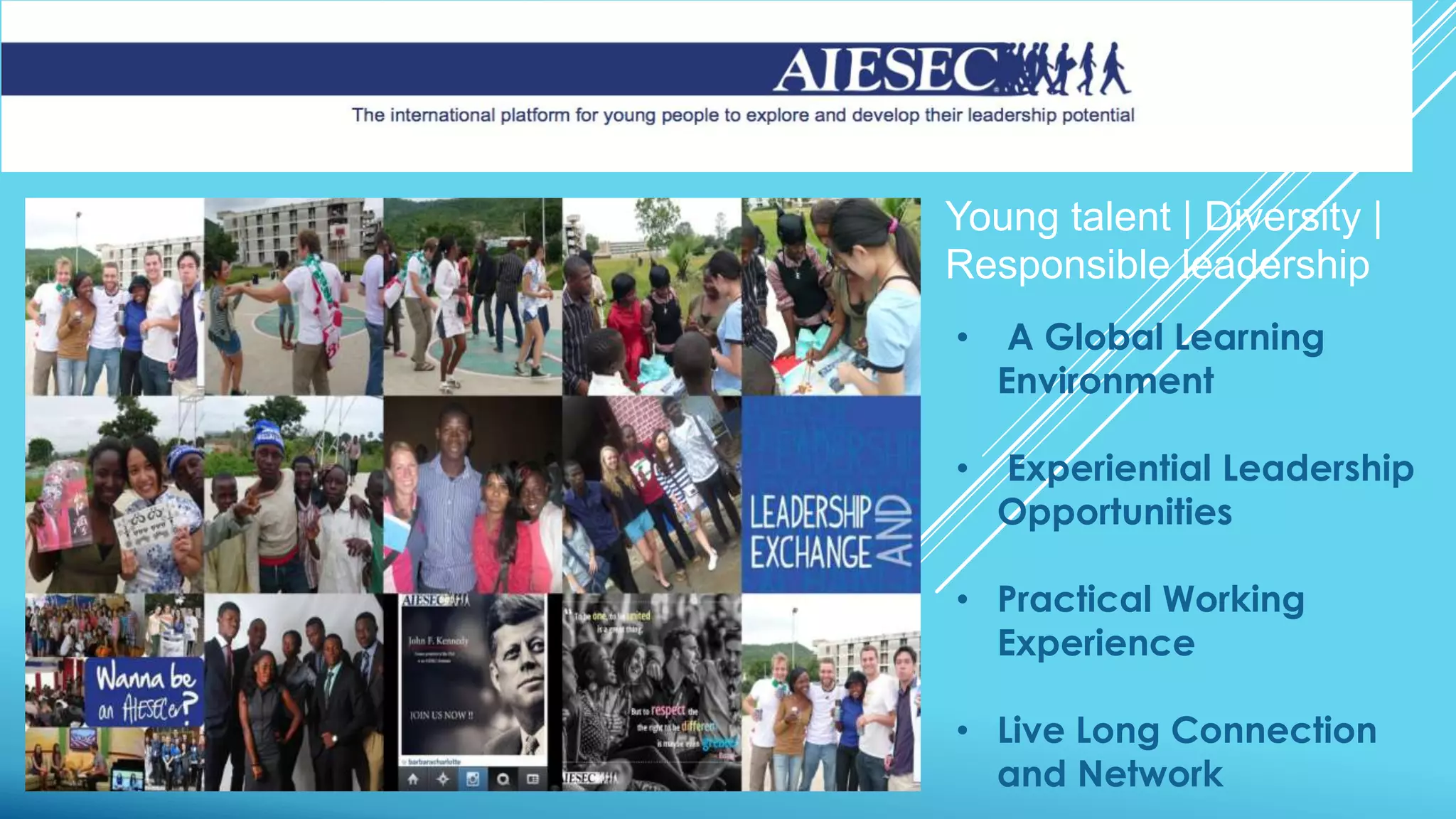 AIESEC is the world's largest student-run organization present in over 100 countries. It provides opportunities for leadership development, cross-cultural exchange, and professional experiences through internships and volunteer projects. In 2012, AIESEC sourced over 10,000 interns for partner organizations and completed over 500 social projects worldwide with over 86,000 members. The organization aims to fulfill humanity's potential through activating leadership in students and graduates.