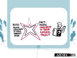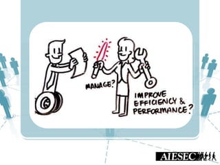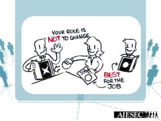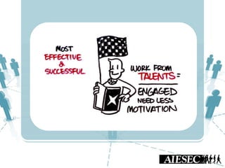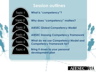 This document outlines Nguyen Ha Giang's presentation on AIESEC's competency model and framework. It defines competency as a combination of skills, attitudes, and knowledge. It then explains that competency models are important for talent management, member development, and achieving organizational goals. The document introduces AIESEC's global competency model of 5 competencies aligned with their mission and vision. It also describes AIESEC Danang's local competency framework which breaks down the 5 global competencies into 11 competencies tailored to their specific situation. Finally, it lists some uses of competency models and frameworks, such as for talent selection, goal setting, performance assessment, and personal development.