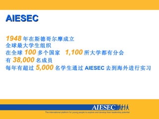 全球最大学生组织 在全球 100 多个国家 1,100 所大学都有分会 有 38,000 名成员 每年有超过 5,000 名学生通过 AIESEC 去到海外进行实习