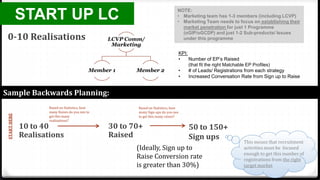 This document provides guidance on structuring marketing teams for Local Committees (LCs) based on their stage of growth and realization goals. It outlines key responsibilities for LCVPs and marketing team members focused on tasks like branding, communications, and driving specific programs like oGIP and oGCDP. Marketing teams should be sized appropriately based on realization targets and focus on just 1-2 key programs or issues. Data-driven backwards planning is recommended to set sign-up and conversion rate goals needed to achieve targeted realizations.