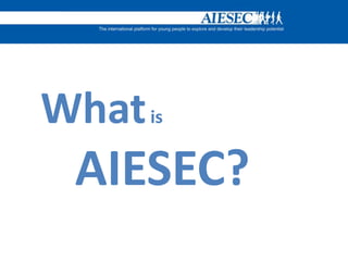 AIESEC is a global, non-political student organization that provides leadership opportunities and international internships to its members. It has a presence in over 107 countries through 1,800 universities. AIESEC connects students with internships and leadership roles to further their development. Major companies partner with AIESEC to source global talent and support leadership training for students.