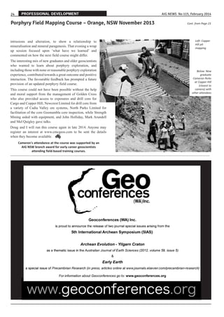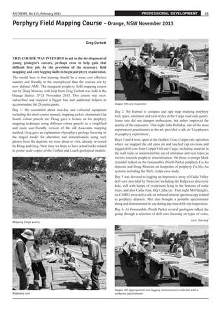The inaugural porphyry field mapping course was held in Orange, NSW over 6 days in November 2013. 26 participants, including both new graduates and more experienced geoscientists, mapped rock units and drill core from local porphyry deposits. They learned mapping techniques, porphyry geology, and how to identify alteration and mineralization. Speakers provided lectures on topics like geophysics, specific deposits, and hyperspectral analysis. Feedback was positive, prompting another offering of the updated course in late 2014.