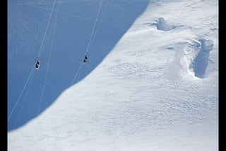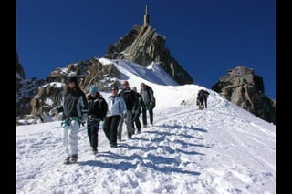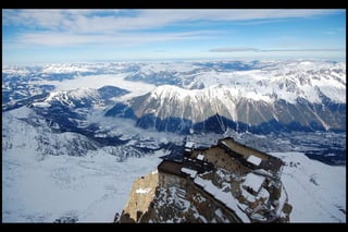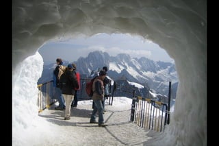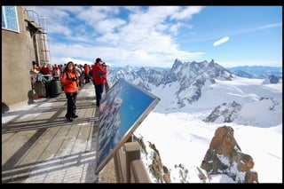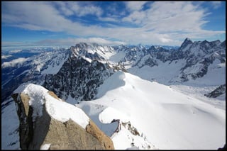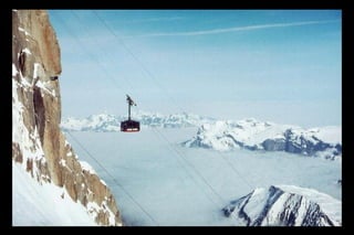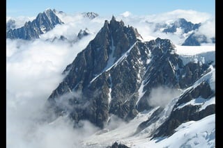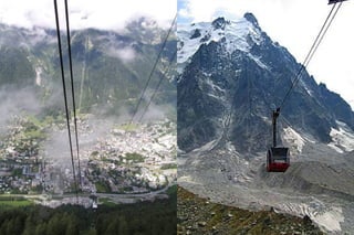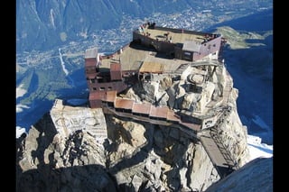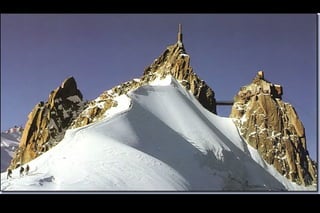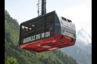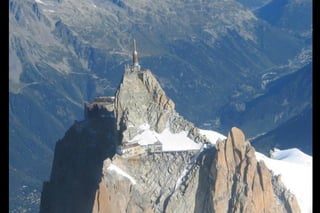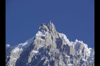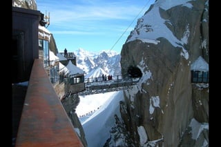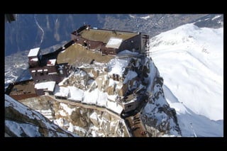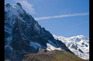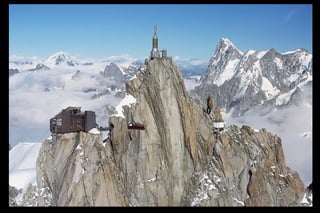 The Aiguille du Midi is a 3,842m mountain in the French Alps. In 1955, the Téléphérique de l'Aiguille du Midi cable car was built to reach its summit, holding the record as the highest vertical ascent cable car in the world. It takes passengers from Chamonix to the summit in 20 minutes, offering panoramic views from its observation platform. The mountain provides access to skiing routes and trails leading to Mont Blanc.