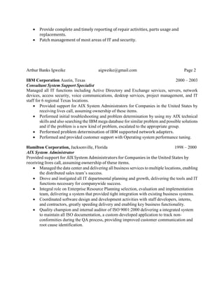 This document is a resume for Arthur Banks Igweike, an experienced senior system support engineer with over 22 years of experience in system engineering, administration, and support working with Unix/Linux systems. It outlines his extensive professional experience at IGT Corporation and previously at IBM Corporation and Hamilton Corporation, and details his education and certifications in related computer and software fields.