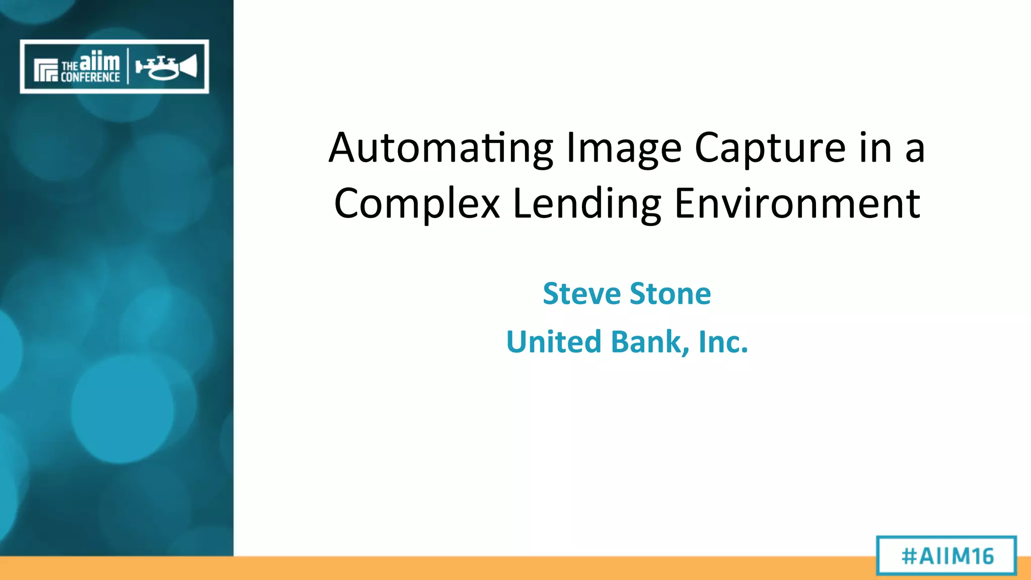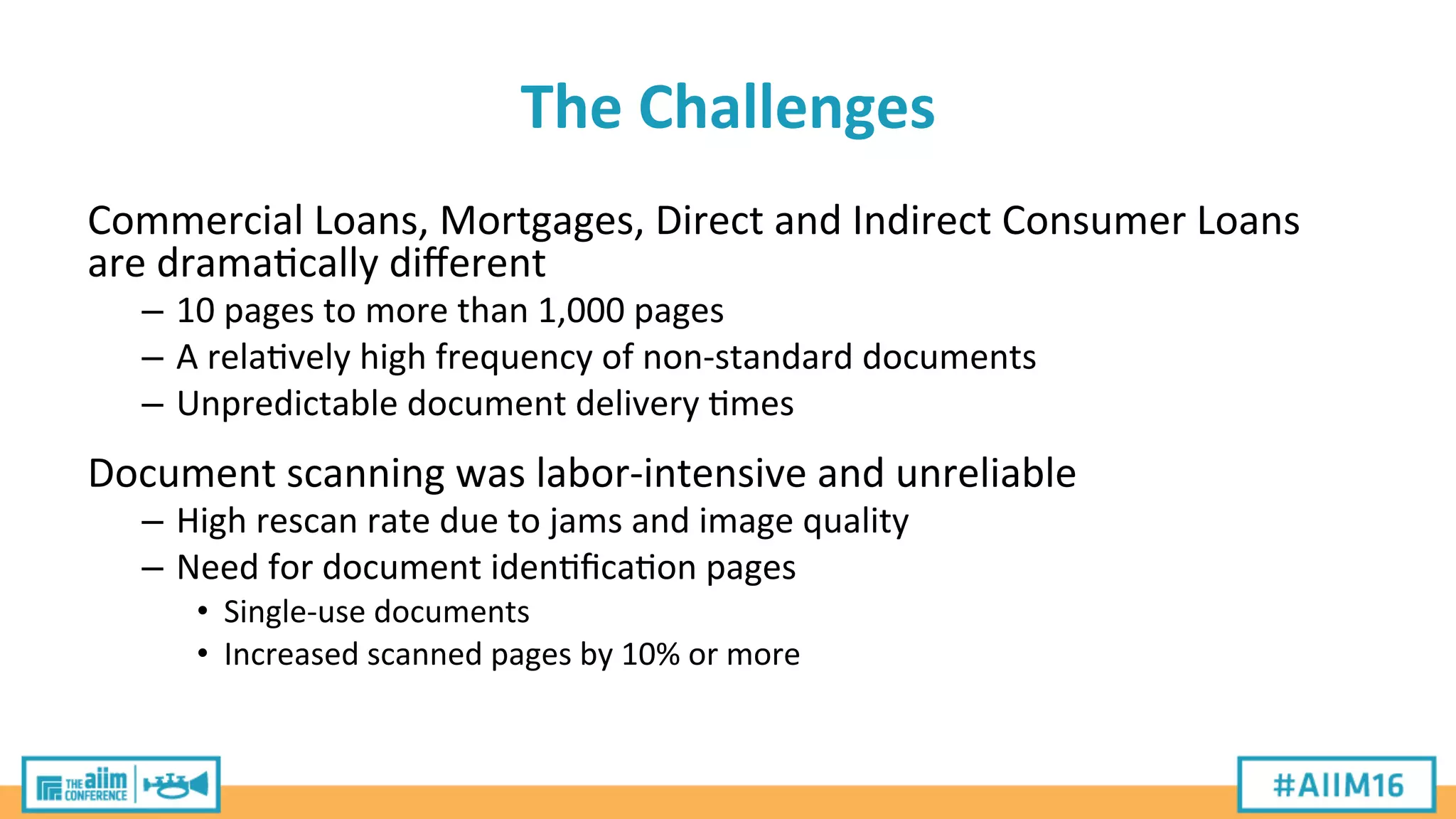 United Bank was facing challenges with their existing document scanning process for loan applications, including high rescan rates, long turnaround times, and labor intensiveness. They worked with a systems integrator to implement a new automated document capture system to improve quality, efficiency and ease of use. The results included significantly reduced rescan and processing times, improved image quality, and reduced labor and storage costs, with the system paying for itself within two years.