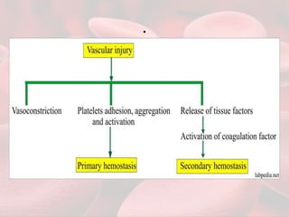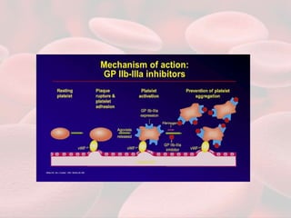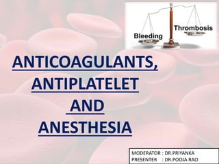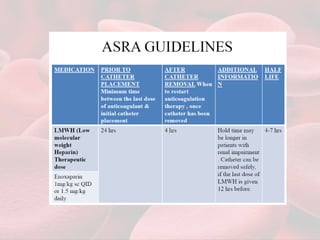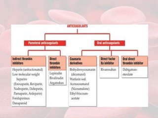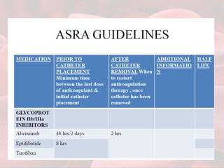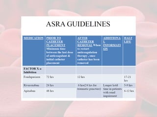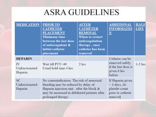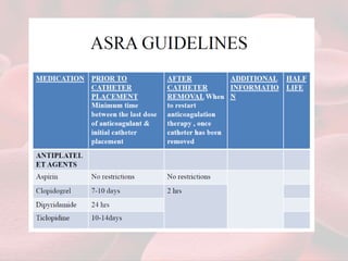 This document summarizes guidelines for providing regional anesthesia to patients taking anticoagulants or antiplatelet drugs. It discusses tests for evaluating primary hemostasis and coagulation, including platelet count, bleeding time, prothrombin time, partial thromboplastin time, and thrombin time. Common anticoagulants and antiplatelet drugs like heparin, warfarin, aspirin, and clopidogrel are described. Risks of regional anesthesia are outlined for different INR levels on warfarin. Perioperative management strategies for bridging anticoagulation and stopping/restarting various drugs before and after surgery are provided.