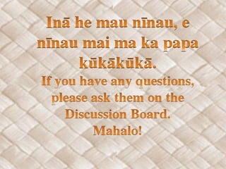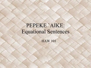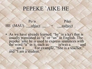 This document provides examples and explanations of different types of equational sentences in Hawaiian using the pepeke 'aike (helping verbs) he and 'o. Pepeke 'aike he is used to express sentences with the word "a" such as "she is a teacher." Pepeke 'aike 'o is used whenever he is not appropriate and can emphasize either the subject or object depending on word order. Examples are given of both types of sentences using different objects and subjects. Guidelines are also provided for determining which pepeke 'aike to use based on what follows the helping verb.