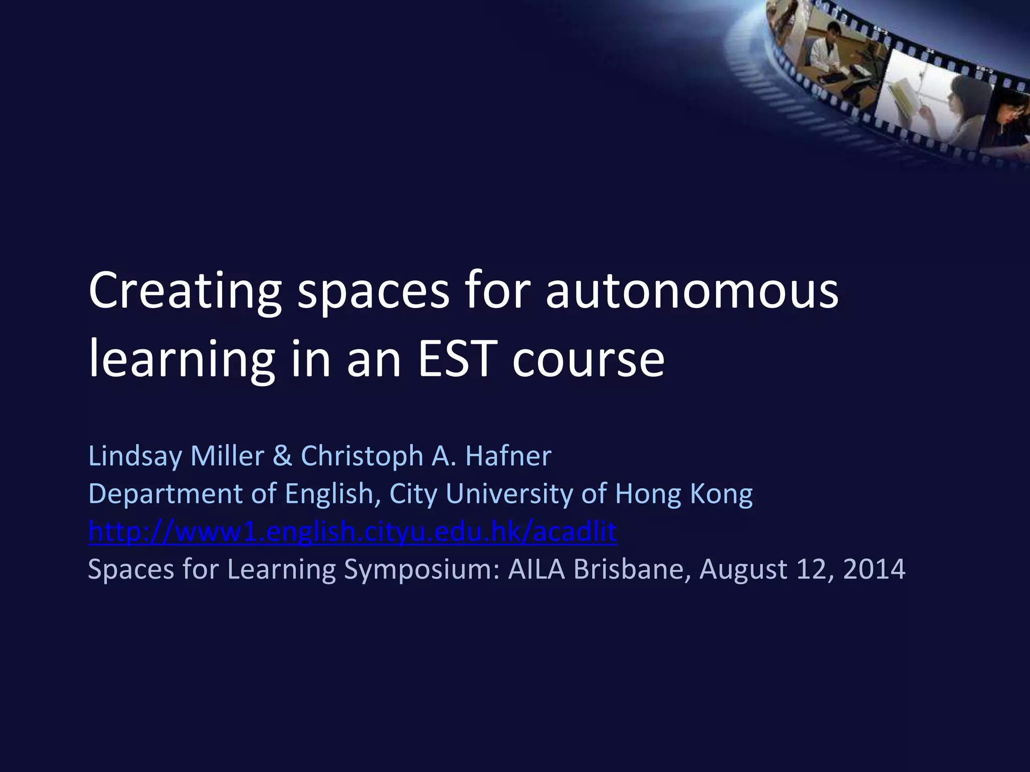 The document discusses the design and implementation of a new English for Science course aimed at creating autonomous learning spaces for students through various projects, including scientific video documentaries and lab reports. Findings indicate that students were engaged and proud of their multimodal projects, showcasing an investment in their learning and willingness to share their work with a broader audience. Additionally, the study highlights the diverse learning spaces students utilized, extending beyond conventional classroom settings.