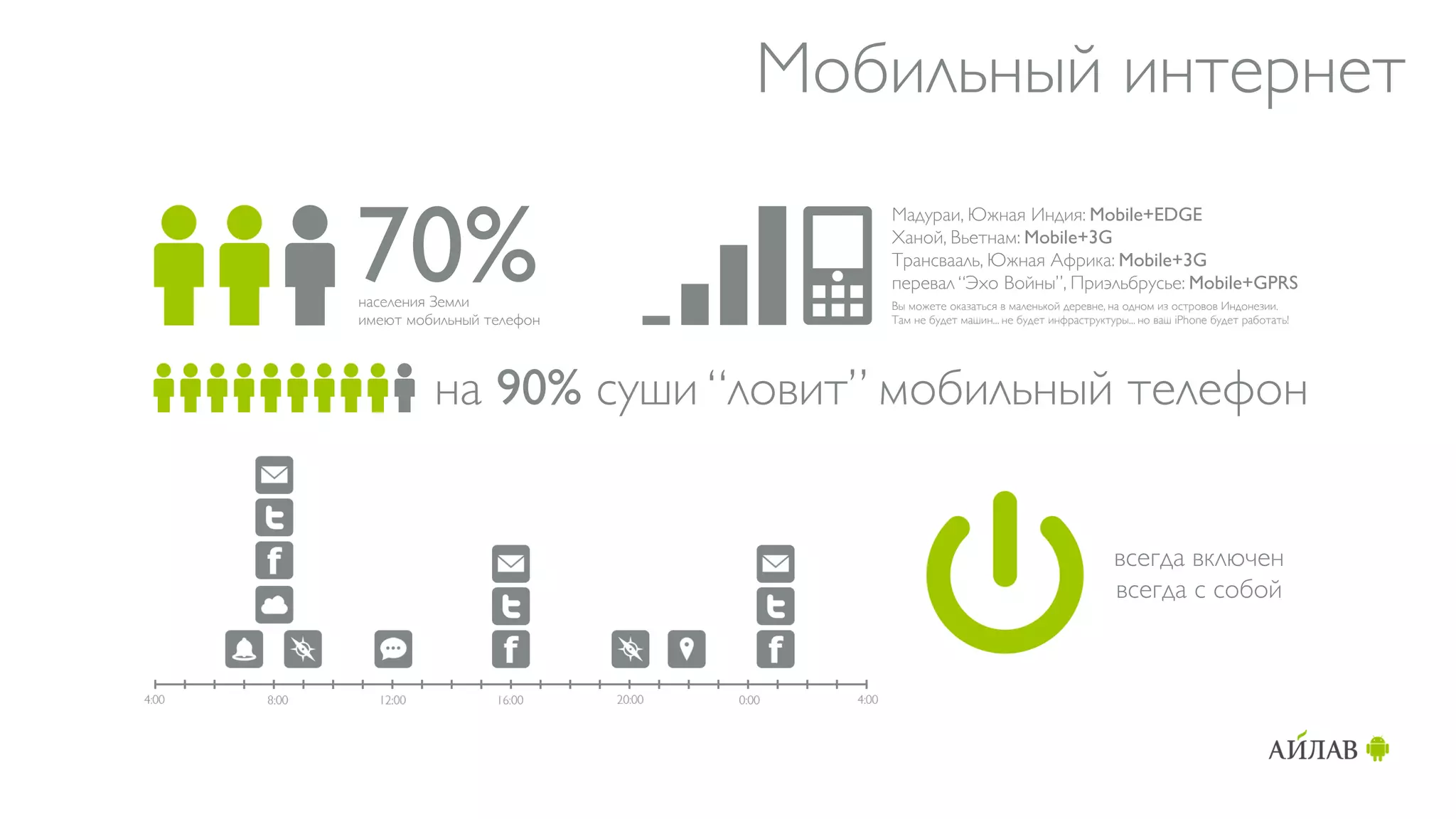 Документ содержит анализ роста мобильного интернета и рынка смартфонов, отмечая, что 70% населения использует мобильные устройства, включая Android. Приведены статистические данные о скачиваниях приложений, а также о фрагментации и проблемах с пиратством на платформе Android. Описываются также рекомендации по проектированию пользовательского интерфейса для мобильных приложений.
