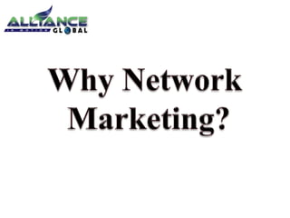 The document outlines the significance of training in network marketing, emphasizing the development of attitude over skills or education. It explains network marketing as a referral-based business model that allows for leveraging efforts to create residual income, highlighting the credibility and future potential of the industry. Key points include the importance of belief in the system, the wellness industry's growth, and the benefits of joining Alliance in Motion Global as a top MLM company.