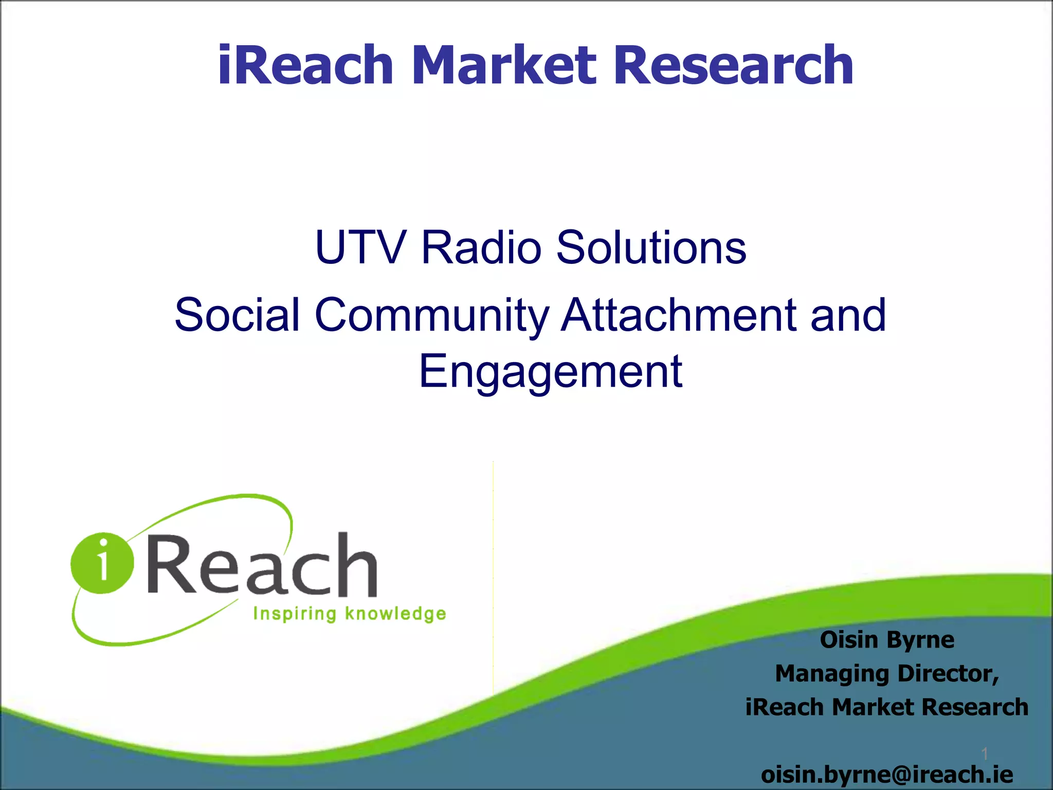 The document outlines a market research project conducted by ireach for UTV Radio Solutions, focusing on the role of local radio in community engagement and advertising effectiveness. The research aimed to assess brand awareness and sales impact associated with local radio stations while identifying shared characteristics among them. Findings indicate a successful launch of the Urban Access advertising initiative, with a reported 20% increase in advertising sales, highlighting local radio's value in community connection.
