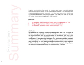 Enlighten Communications has developed a comprehensive marketing campaign to solidify AIM's position as a leading instant messaging service and expand its presence in the social media market. The strategy includes increasing brand awareness, bridging the gap between AIM and social media products, and enhancing product usage through a viral advertising approach. Key findings suggest a significant portion of young adults are unaware of AIM's social media offerings, highlighting the need for improved navigation and communication of AIM's products.