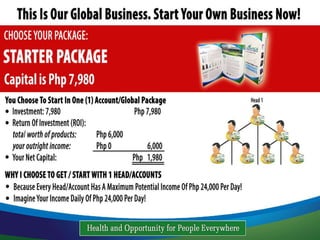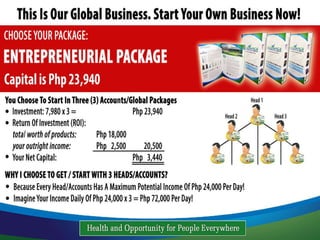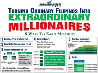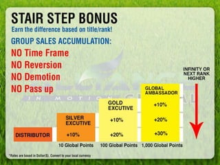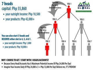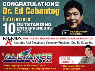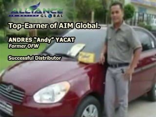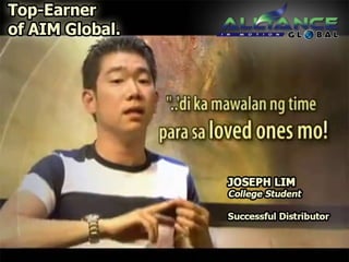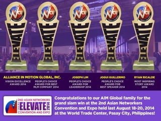 Alliance in Motion Global (AIM Global) is a Filipino-owned multi-level marketing company founded in 2006 that focuses on the wellness industry, creating nearly 1,000 millionaires over eight years. The company provides a unique marketing plan with various income opportunities, requiring initial capital for distributors to start their business while promoting health products. AIM Global emphasizes personal growth and financial freedom, offering numerous benefits and support for its distributors to succeed in a competitive market.