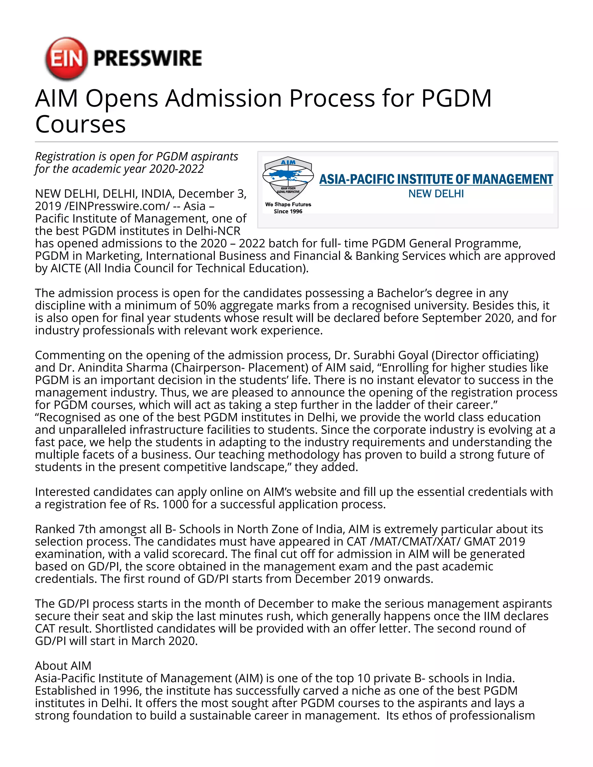 Asia-Pacific Institute of Management (AIM) has opened admissions for its 2020-2022 PGDM courses, including general, marketing, international business, and financial & banking services. Eligible candidates include those with a bachelor's degree with at least 50% marks, final year students, and industry professionals with relevant experience, who must also have taken management entrance exams. The admission process includes a registration fee of Rs. 1000 and rounds of group discussion and personal interviews starting December 2019.