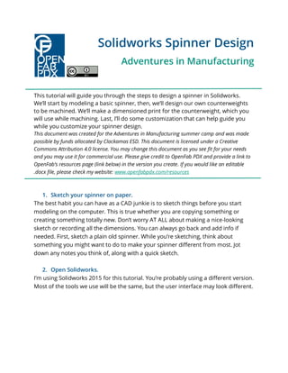 This document is a tutorial on designing a spinner using SolidWorks, detailing the steps for modeling, creating counterweights, and customizing the spinner. It includes instructions on sketching, navigating the software interface, and applying features like extrude, pattern, and refine edges. The tutorial was prepared for a summer camp and is licensed under Creative Commons, allowing users to adapt it for their needs with proper attribution.