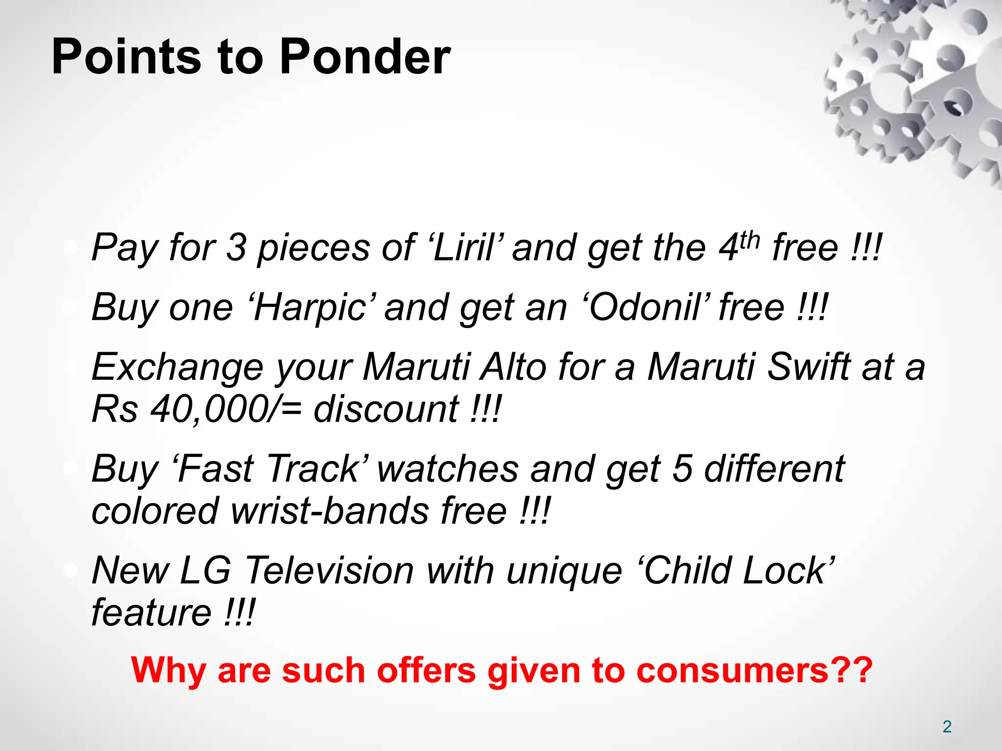 The document discusses consumer behavior and provides examples of marketing strategies used to influence consumer behavior. It begins by providing examples of promotional offers provided to consumers and discusses why such offers are given. It then covers theories related to consumer behavior such as Pavlov's classical conditioning theory. The document summarizes that studying consumer behavior is important for marketing success as consumers evolve over time. It covers key aspects of studying consumer behavior including segmentation, factors influencing behavior, and learning.