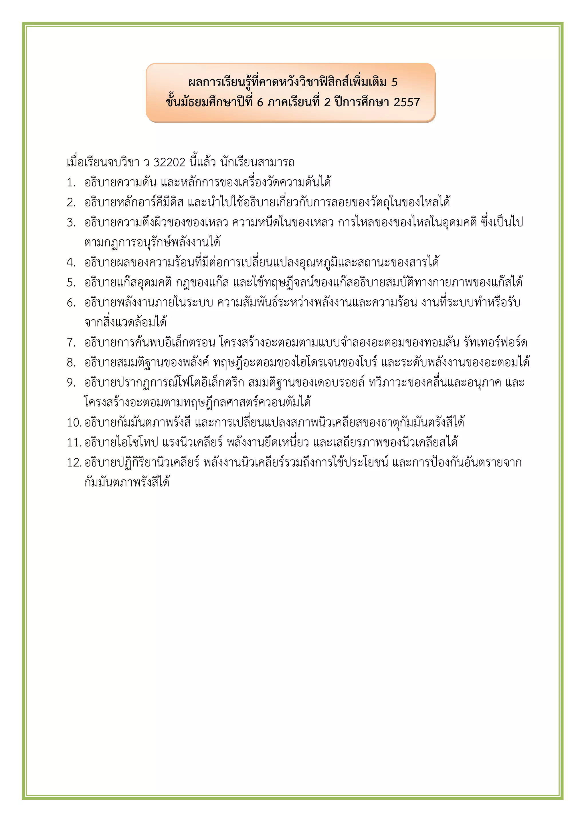 ผลการเรียนรู้ที่คาดหวังวิชาฟิสิกส์เพิ่มเติม 5 ชั้นมัธยมศึกษาปีที่ 6 ภาคเรียนที่ 2 ปีการศึกษา 2557
