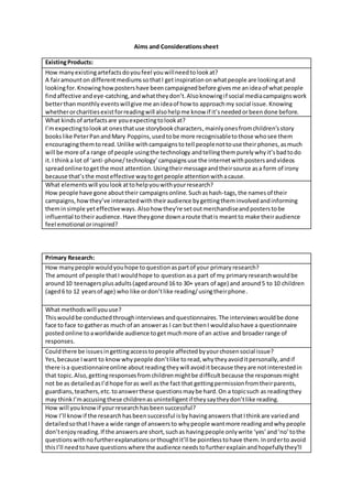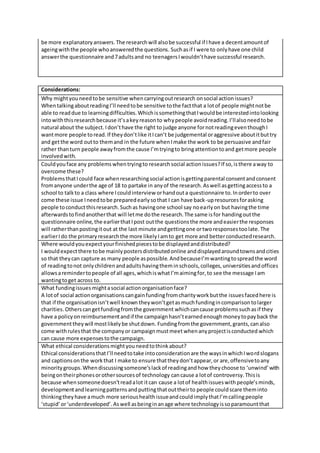 The document provides details about the research a student plans to conduct for a social action campaign promoting reading. They intend to interview 10-15 people aged 16-30 and 5-10 children aged 6-12 about their reading habits and technology use. Online questionnaires will also be used. The research aims to understand why some people dislike reading and avoid it. Sensitive issues may need to be handled carefully, like not judging those who don't read. The final pieces will likely be posters distributed online and in public places.