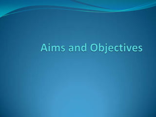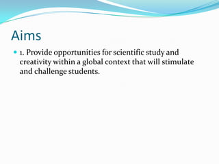 This document outlines 10 aims and 5 objectives for a science curriculum. The aims are to provide opportunities for scientific study and creativity globally, provide a body of scientific knowledge and techniques, enable students to apply science, develop skills in analysis and synthesis of scientific information, foster collaboration and communication, develop investigative skills, apply information technology skills to science, raise awareness of implications of science and technology, develop appreciation of possibilities and limitations of science, and encourage understanding of relationships between scientific disciplines. The objectives are to demonstrate understanding of physics, apply physical principles, construct research questions, demonstrate cooperation and responsibility, and safely manipulate apparatus and perform experiments.