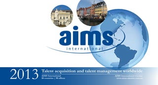 Документ описывает деятельность компании AIMS International в области подбора и управления талантами на международном уровне, охватывая 50 стран и 90 офисов. Он подчеркивает важность эффективного управления талантами для достижения организационных целей. Указаны офисы компании в различных странах, включая Украину и Чехию.