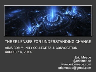 The document discusses three lenses for understanding change in community colleges: linear, systems, and complex, using historical case studies from various timeframes. It poses questions about trends observed at Aims Community College and anticipates future implications for higher education by 2030. Additionally, it explores stages of social evolution and ego development, emphasizing the need for a balanced view that recognizes both rational and intuitive perspectives.