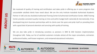 AIMS Training Center is an authorized Autodesk training and certification center located in Abu Dhabi, UAE. It provides training in engineering software, management skills, languages, and other areas. AIMS aims to offer high quality training programs to satisfy customers and help individuals and organizations succeed. It prides itself on its experienced trainers and facilities to support innovative training delivery.