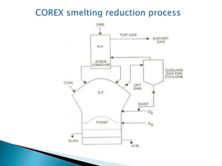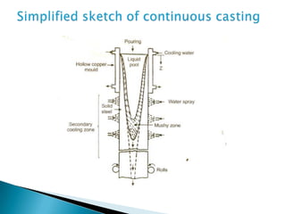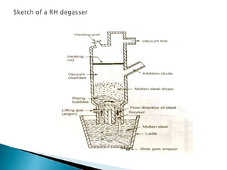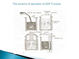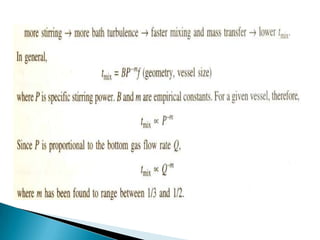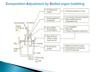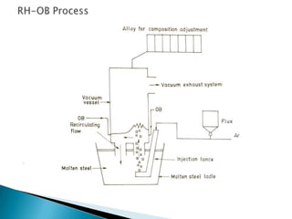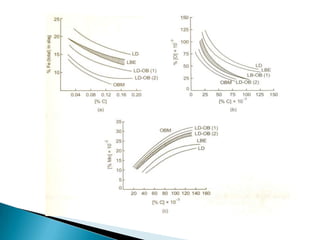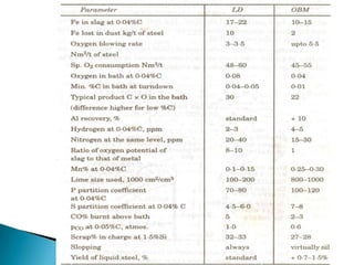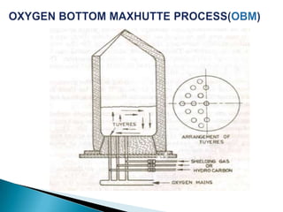 The document discusses hybrid blowing in steelmaking. Hybrid blowing involves blowing a portion of oxygen from the bottom of the vessel along with blowing from the top. Blowing oxygen from the bottom improves mixing and homogeneity in the bath, reduces slopping, and leads the process closer to equilibrium, improving dephosphorization and desulphurization abilities. Compared to top blowing or bottom blowing alone, hybrid blowing provides benefits such as improved control, reduced over-oxidation, and higher yields.
