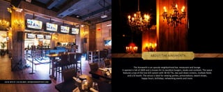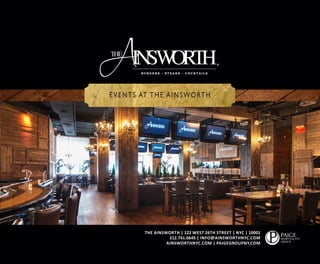 The document provides information about event spaces and amenities at The Ainsworth, an upscale neighborhood bar, restaurant and lounge in NYC. It details the capacities, sizes, seating arrangements and audio/visual capabilities of three event spaces - the Back Lounge, High Tops, and Dining Tables. An on-site audio/visual technician is recommended to handle any technical needs. The Ainsworth also has an American-style catering menu and cocktail program.