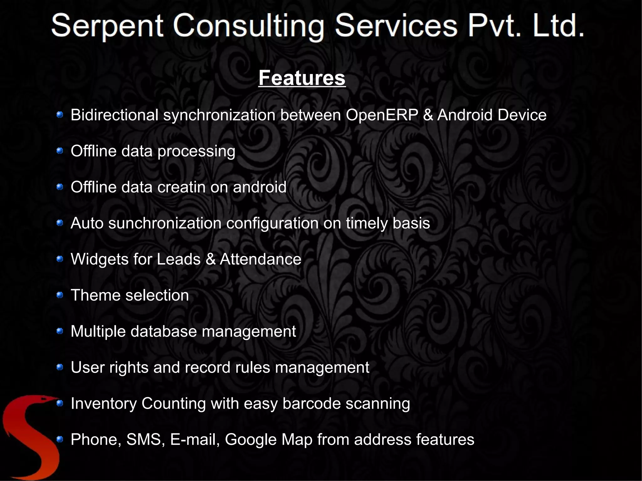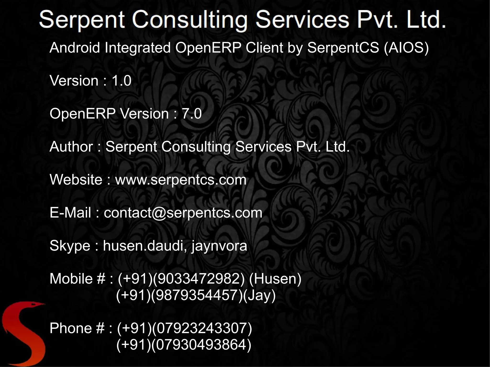 The document describes the features of the Android integrated OpenERP client version 1.0 by Serpent Consulting Services, highlighting bidirectional synchronization, offline data processing, and user management capabilities. It offers tools for project and attendance management, inventory counting with barcode scanning, and communication features including direct calls and emails. For additional details and a demo, the document provides contact information for support.