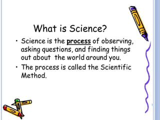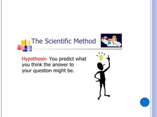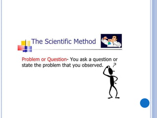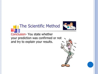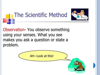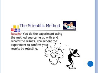 This document outlines the steps of the scientific method, which include making observations, formulating a question, developing a hypothesis, experimentation, analyzing results, and drawing conclusions. It discusses key aspects of each step, such as developing testable hypotheses, controlling variables in experiments, collecting and organizing quantitative and qualitative data, and communicating findings. The overall purpose is to explain the scientific method and its importance as the only accepted way to validate theories through research.