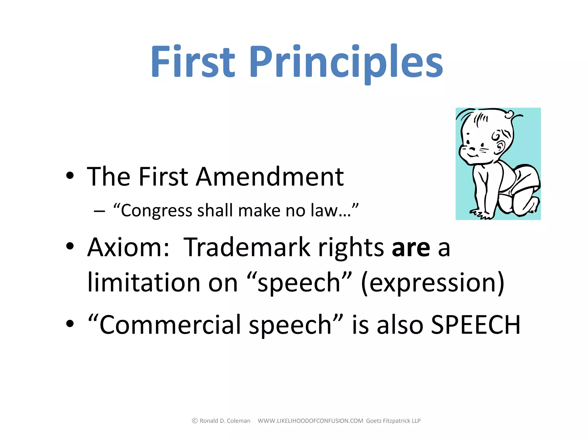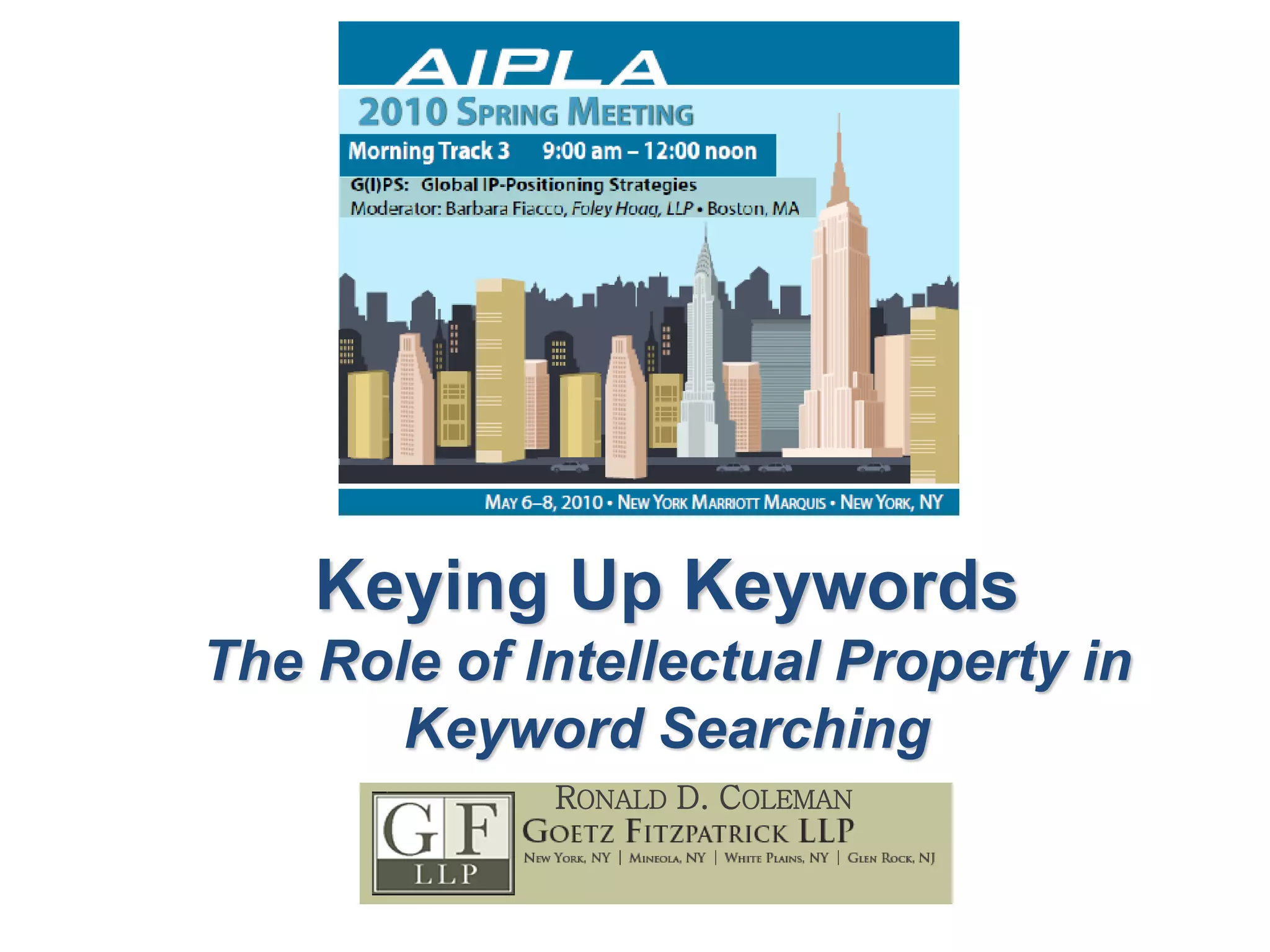The document discusses the role of intellectual property in keyword searching, focusing on trademark rights and their limitations on free speech. It emphasizes the importance of cautious court rulings regarding trademark protection to prevent suppressing expression, citing various legal precedents. Additionally, it addresses the complexities of 'initial interest confusion' in digital advertising and its implications for search engines like Google regarding trademark use.