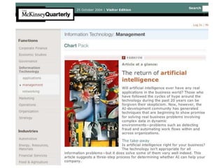 Dr. C. Lee Giles is a professor at Penn State University who teaches a course on artificial intelligence and information sciences. The document provides an overview of artificial intelligence including definitions, theories, impact on information science, and topics covered in the course such as machine learning, information retrieval, text processing, and social networks. It also discusses the scientific method applied to developing theories in information sciences and contrasts weak and strong definitions of artificial intelligence.