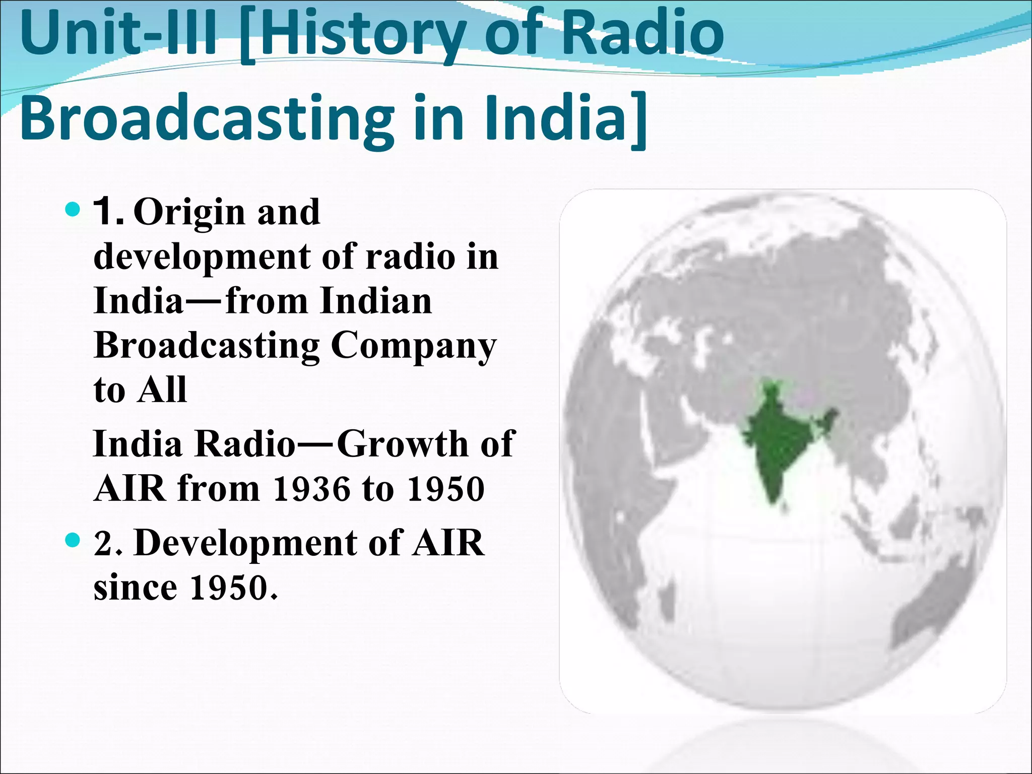 This document discusses the history and development of radio broadcasting in India from its origins with the Indian Broadcasting Company to the current organization All India Radio (AIR) under Prasar Bharati. It outlines the organizational structure and functions of AIR, the different types of radio broadcasts, and the autonomy and privatization of radio over time. It also describes the code of conduct for radio broadcasts, particularly regarding elections.