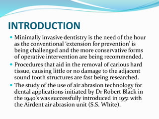This document discusses air abrasion technology for dental applications. It begins by introducing the concept of minimally invasive dentistry and how air abrasion aids in removing carious hard tissue with little damage to sound structures. While air abrasion was introduced in the 1940s, it did not gain popularity initially due to limitations in materials, cavity preparation techniques, and suction capabilities. The document describes how air abrasion works using compressed gas to direct aluminum oxide particles to remove tooth structure. It outlines the parameters that control tooth removal and discusses improved bonding agents and restorative materials that have allowed air abrasion to become more widely used for applications like removing caries, preparing teeth for restorations, and removing old restorations. Access