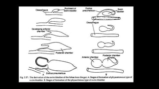 The document discusses the functions and structures of the air bladder and Weberian ossicles in bony fishes, explaining their roles in buoyancy regulation, hydrostatics, and sound production. It outlines the basic structure, types of swim bladders (physostomous, physoclistous, and transitional), and their functionality in respiration and equilibrium within water. The Weberian ossicles enhance sound transmission to the inner ear and are sensitive to changes in swim-bladder volume, acting as pressure registers and auditory organs.