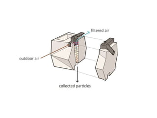 The document describes the Breathe Brick, an innovative air-cleaning brick developed by Carmen Trudell. The brick works like a vacuum cleaner to suck pollution from the air and filter out particles. At the center of each brick is a cyclone filtration system that separates heavy pollutant particles from the air and deposits them in a removable hopper. In tests, the bricks were found to filter 30% of fine particles and 100% of coarse particles from the air. The low-cost bricks could help lower pollution levels in developing countries experiencing rapid industrialization.