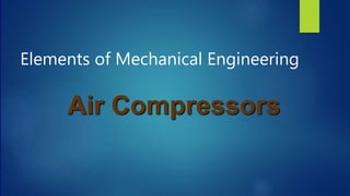 This document discusses different types of air compressors and components of compressed air systems. It describes the main types of compressors as positive displacement (reciprocating and rotary) and dynamic (centrifugal and axial). Reciprocating compressors use pistons to compress air in a pulsing manner, while rotary compressors use rotors for continuous compression. Centrifugal compressors use an impeller to transfer energy and compress large volumes of air continuously. The document also discusses assessing compressor efficiency using various metrics and identifies opportunities to improve energy efficiency such as reducing leaks, properly setting operating pressures, controlled usage, and implementing maintenance best practices.
