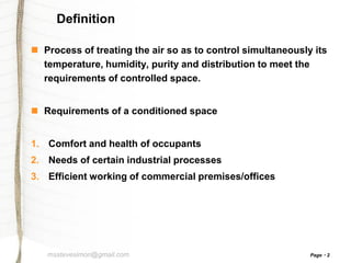 This document discusses air conditioning systems. It defines air conditioning as controlling the temperature, humidity, purity and distribution of air in an enclosed space. It notes that for human comfort, air temperature should be between 22-27°C and relative humidity between 55-65%. The document describes the key components and processes of winter and summer air conditioning systems. Winter systems heat and humidify air while summer systems cool and dehumidify air. The document also discusses applications of air conditioning and classifications of systems based on the conditioning processes required.