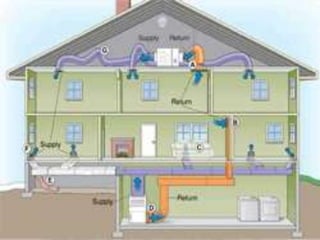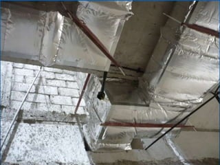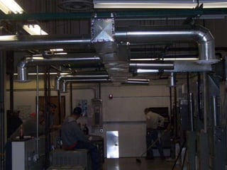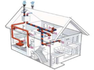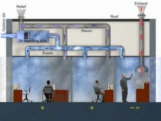 The document discusses air conditioning systems. It describes how air conditioners work using a refrigerant chemical to transfer heat from inside to outside. There are three main parts: a compressor, condenser, and evaporator. Air conditioning systems can be individual units, unitary packaged systems serving multiple rooms, or central hydronic systems with air handling units, water systems, and a central plant. Properly sizing and installing air conditioners can improve energy efficiency. The goal of AC system design is to have an effective, efficient, and cost-effective system that meets requirements.