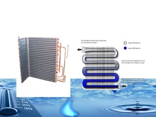 The document discusses the components and process of an air conditioning system. It describes the key elements as the compressor, condenser, expansion valve, and evaporator. The refrigerant gas flows in a cycle between these components, being compressed into a hot gas in the compressor, condensed into a liquid in the condenser, expanded in the expansion valve, and evaporated to absorb heat in the evaporator. There are different types of air conditioning systems including room, package, and central systems.