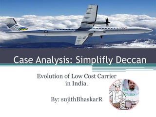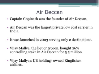 This document summarizes the evolution of low-cost carriers in India, focusing on Air Deccan. It discusses that Air Deccan was founded in 2003 and grew rapidly but faced financial issues from overexpansion. Vijay Mallya acquired a controlling stake in 2007 to address these issues. The Indian aviation market was growing rapidly at over 25% annually but faced challenges like lack of airport infrastructure and air traffic controllers. Air Deccan targeted leisure travelers and competed with other low-cost carriers like SpiceJet and IndiGo. By 2007, Air Deccan was facing high employee turnover and technical issues, leading Mallya to consider options like merging it with his airline Kingfisher.