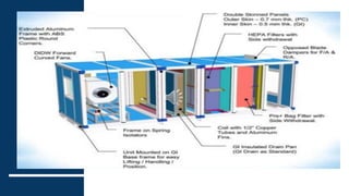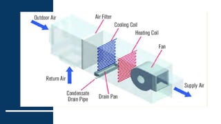 2) AHUs can be classified based on fan location as draw-through or blow-through units. Draw-through units have fans after coils while blow-through units have fans before coils.