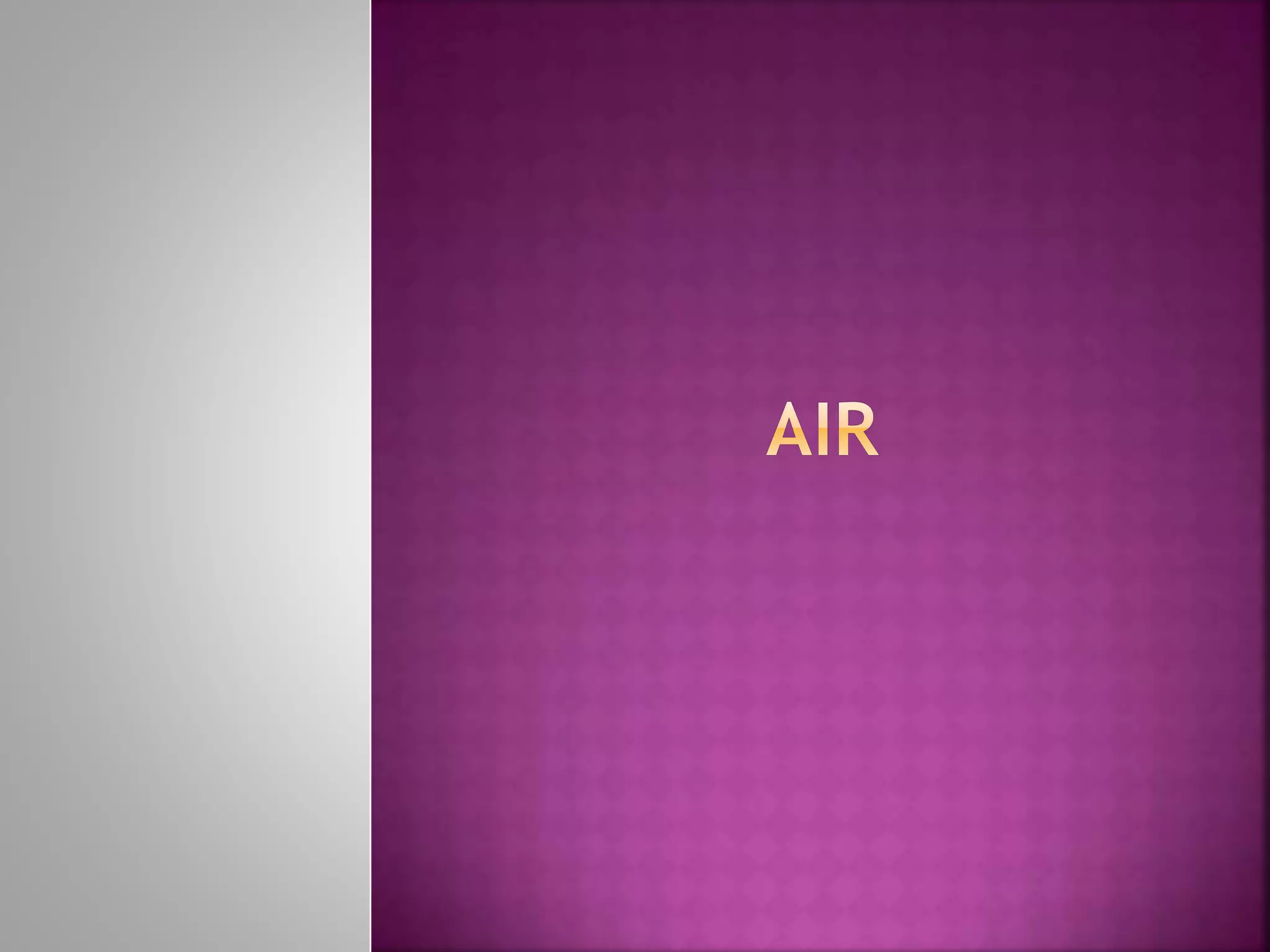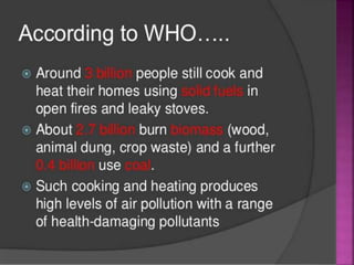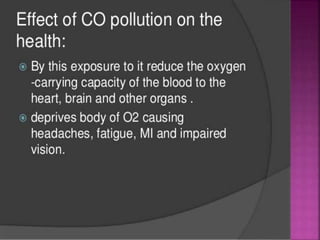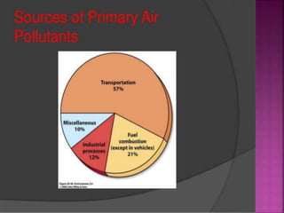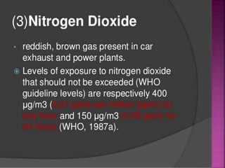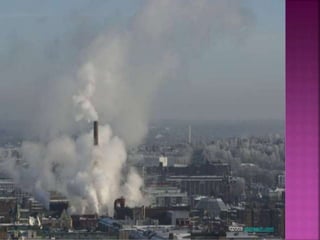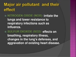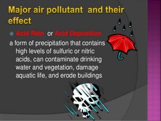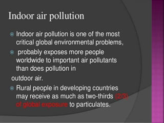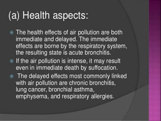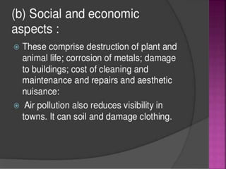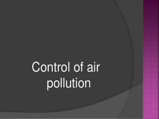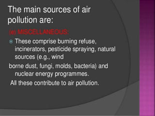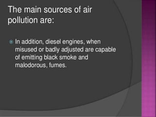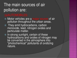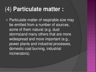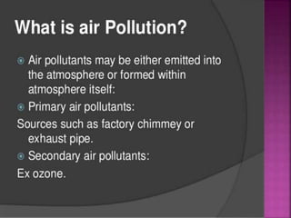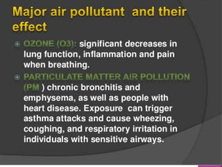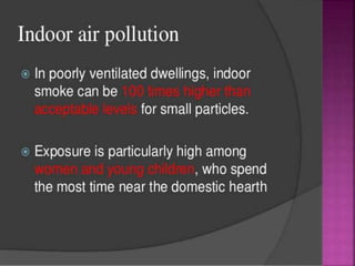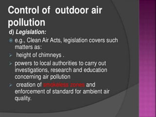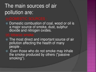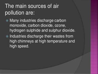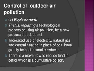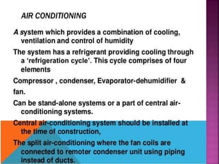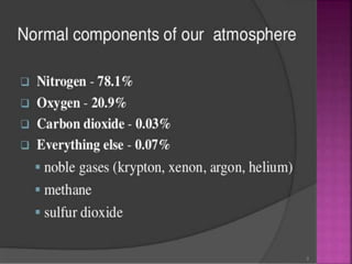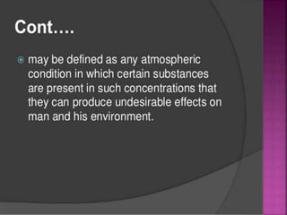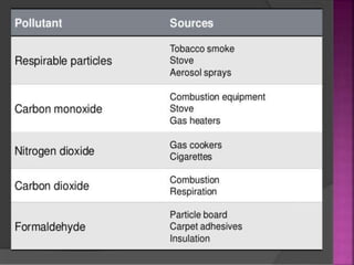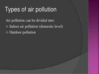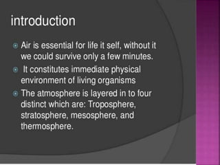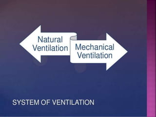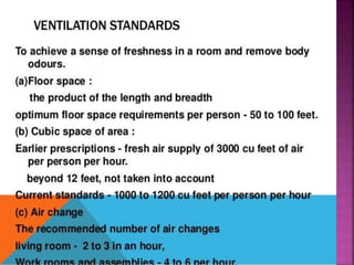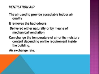 Air is composed primarily of nitrogen, oxygen, and trace amounts of other gases. It also contains water vapor and suspended particles. Human activities like breathing, combustion, and industry introduce impurities into the air. Natural mechanisms like wind, sunlight, rain, and plant life help cleanse the air. When many people occupy confined indoor spaces, the air becomes contaminated through chemical changes like rising carbon dioxide and physical changes like increased temperature and humidity. Proper ventilation is needed to replace stale air and maintain a thermally comfortable environment for occupants. Various natural and mechanical ventilation methods aim to regulate indoor air quality and temperature.