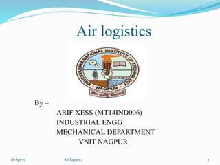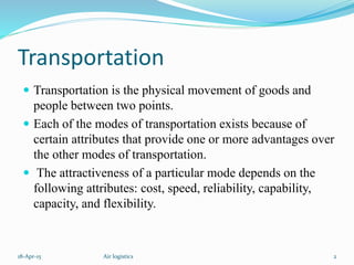 The document discusses various modes of transportation including airfreight, pipelines, ropeways, and their roles in logistics. It describes that air is the fastest transportation mode for shipments over 600 miles and is commonly used to transport perishable goods and urgent deliveries. Pipelines are an effective means to transport liquids and gases over long distances at low costs. Ropeways are used to transport people and goods across difficult terrain like hills and rivers. The International Air Transport Association (IATA) regulates standards and rates for air cargo transportation globally.