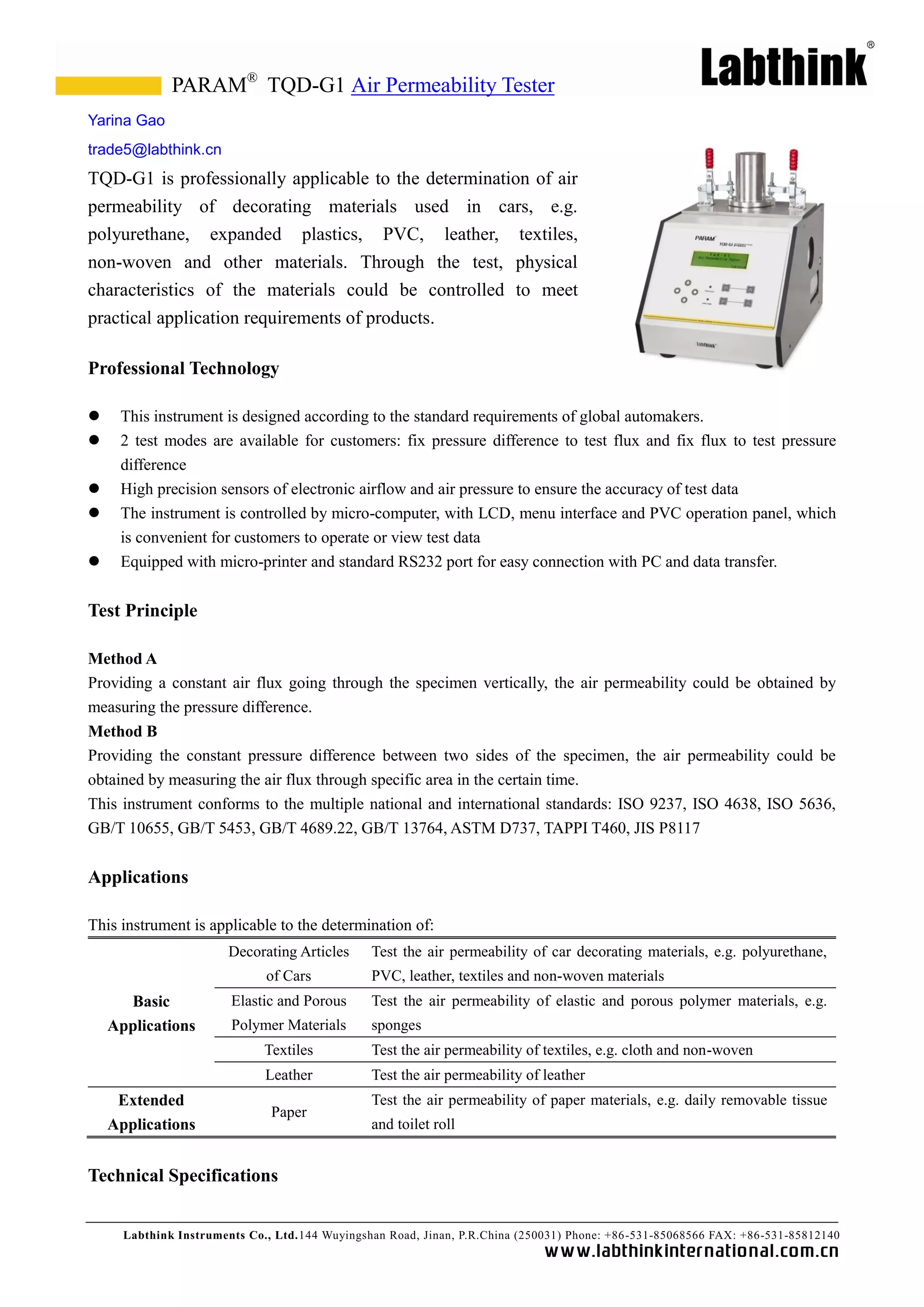 The TQD-G1 air permeability tester is designed for determining the air permeability of automotive decorating materials such as polyurethane, textiles, and leather. It features two testing methods, high precision sensors, and micro-computer control for accuracy and user convenience. The instrument meets various international and national standards and includes multiple applications for testing different materials.